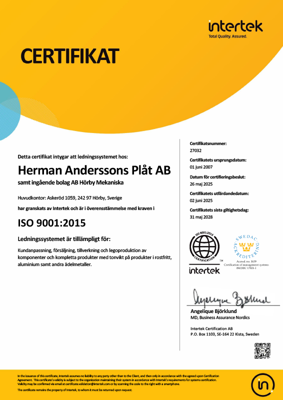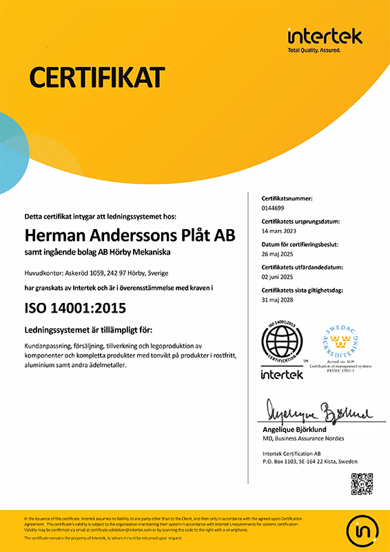 Sedan år 2007 är Herman Andersson Plåt AB certifierade enligt ISO9001:2015. Sedan år 2023 är vi även certifierade enligt ISO14001:2015.